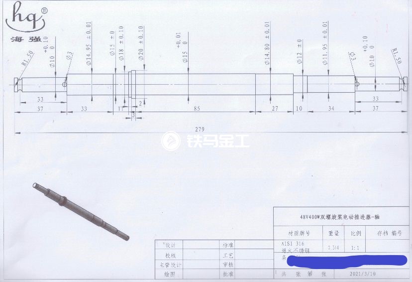 因公司电机生产需机加工不锈钢304材质的电机轴,样品二根。具体尺寸与要求,见图纸!望能力的生产厂家报包工包料含税含运费的优惠价!